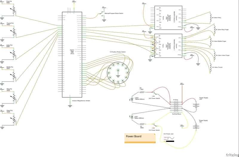 18. 現在打開24V電源開關。將功能選擇開關撥到一檔,您應該可以用五個電位器中的一個來控制每個手指。試著將佔空比電位器調整到不同的位置,看看效果如何。將功能選擇開關撥到另一檔,12位開關將控製手的位置或移動。