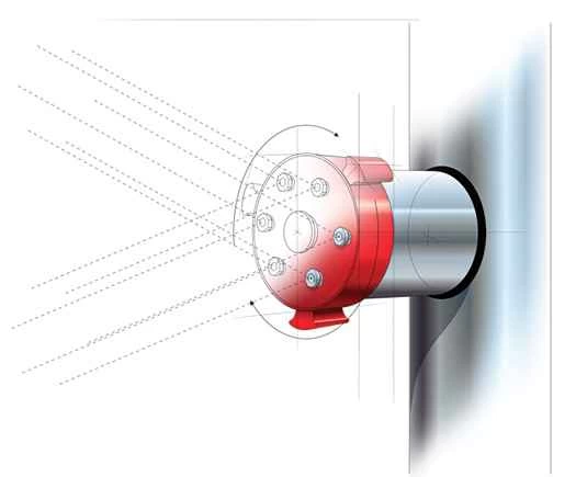 六個小型噴霧噴嘴旋入直徑 2.5 英吋的不銹鋼出水帽中,從消防車的水箱噴出水。
