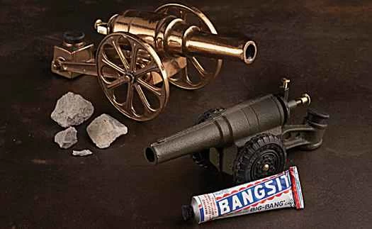 乙炔與空氣混合也會產生非常響亮的爆炸聲。這正是我小時候對某款玩具炮如此著迷的原因。這款玩具炮使用一種名為「Bangsite」(玩具製造商對碳化鈣粉末的稱呼)的燃料,其後膛裝填機構會將這種化合物傾倒進一個鎖定的水箱中。然後,用燧石點燃發射柱塞,即可發射氣體。
