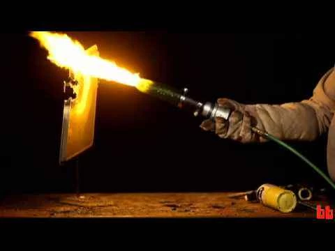 不,我是認真的。我做的這個裝置是一種熱能切割槍。熱能切割槍通常用鐵而不是培根做成,用來切割廢金屬和從倒塌的建築物中救人。它的工作原理是向裝滿鐵棒和鎂棒的管道中吹入純氧氣。這些金屬在純氧中極易燃燒,燃燒時會釋放出大量的熱量。最終,一股超高溫的鐵等離子體從管道末端噴射而出。論破壞力,很少有工具能與熱能切割槍相提並論。但鐵並不是唯一一種在純氧流中易燃的物質。