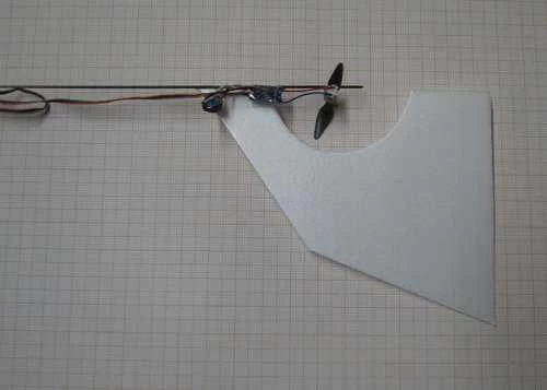 * 3 hacked servos: 3 x 1.7 * 3 propellers: 0.17 * Receiver: 0.68 * 80 mAh battery: 2.6 * 33 cm x 1mm diam. carbon rod: 0.4 * Battery lead: 0.3 * Depron fin (estimate): 0.5 * Allowance for tape and glue (estimate): 0.25總計:10克* 3 hacked servos: 3 x 1.7 * 3 propellers: 0.17 * Receiver: 0.68 * 80 mAh battery: 2.6 * 33 cm x 1mm diam. carbon rod: 0.4 * Battery lead: 0.3 * Depron fin (estimate): 0.5 * Allowance for tape and glue (estimate): 0.25