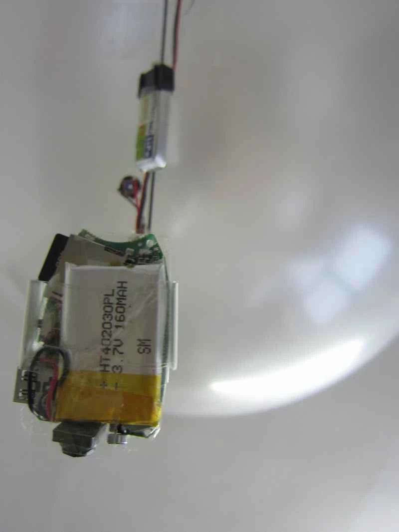 - 一顆70至140毫安培時的1S鋰聚合物電池(以及適當的充電器):為了將重量控制在10克以下,需要使用最小的電池(70毫安培時的電池重量約為2.5克)。較大的電池顯然可以延長飛行時間,但即使飛行時間很大程度取決於飛行方式,使用125毫安培時的電池(重量為3.5克)也能輕鬆飛行半小時。較小的電池也能輕鬆飛行15分鐘或更久,並且能夠延長乳膠氣球的飛行時間(騰出空間放置更多配重來彌補氦氣的損失)。