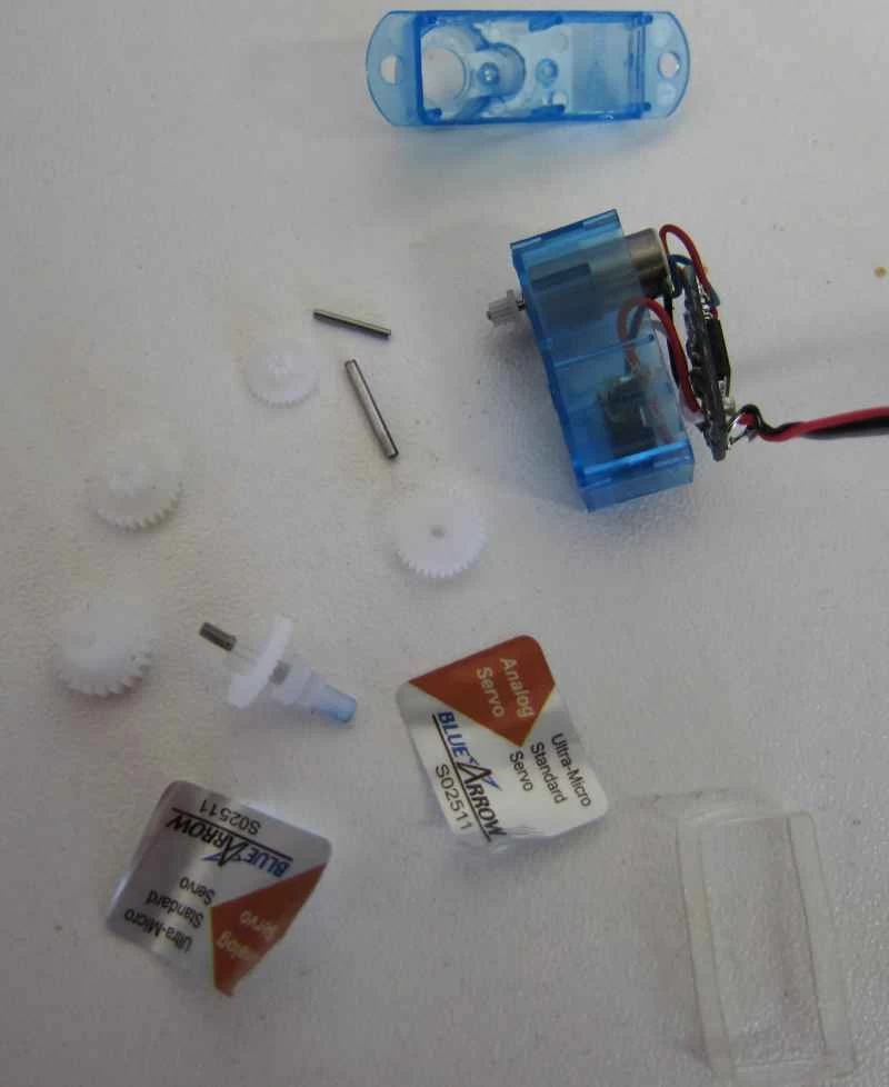 - 三個超微型舵機,重量在 2.5 克或以下:我使用的是 Blue Arrow 品牌的舵機。這些舵機可以輕鬆安裝螺旋槳(馬達軸直徑為 0.7 毫米)。