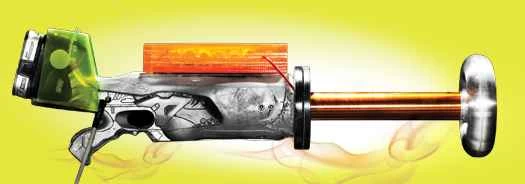電流流入弗利克格稱為「死亡冰球」的裝置-一個填充矽膠的PVC管端蓋。在槍內部,一個來自舊電視機的變壓器和額外的電路會反覆將電流加倍,然後將其輸送到電容器組。當六個電容器儲存了20000伏特時,槍就開始發射。儘管如此強大的電流仍然會燒毀一些冰球,因此弗利克格最近測試了一種矽膠和六方氮化硼的混合物,這種混合物可以帶走熱量,從而保護電子元件。
