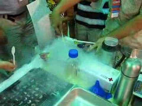 我們按照標準的冰淇淋配方混合了2誇脫奶油、糖、雞蛋、香草精和調味料。 (幾乎任何冰淇淋配方和口味都可以。)然後,在通風良好的地方操作(以免液態氮取代空氣中的氧氣),並充分考慮到液態氮能將人體組織凍成固體,我們像拌入蛋白一樣,輕輕地將大約2公升液態氮糖漿直接拌入奶油中。