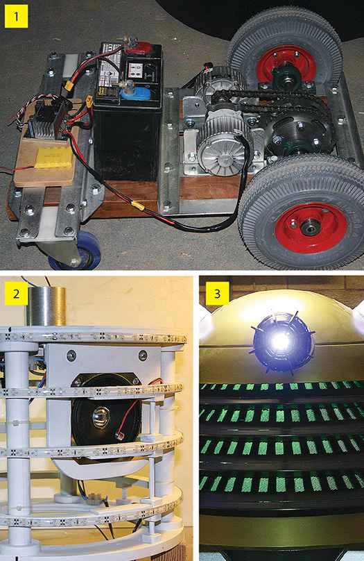 這個外星人的裝甲軀幹放置在一個裝有腳輪和電動代步車輪子的木製平台上。雖然最初的戴立克是從周圍環境中汲取能量,但羅西特的這個戴立克依靠一塊標準的12伏特汽車電池供電。