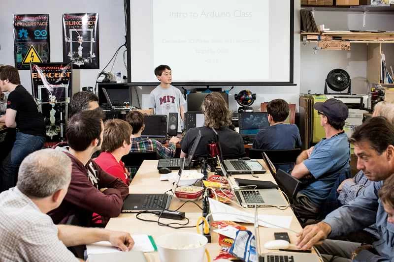 大多數人並不知道他們的老師——一位在DIY電子領域冉冉升起的新星——竟然也只有12歲。 「這是個油箱蓋。嗯,其實是個放屁感應器,」他一本正經地說道,語氣神秘莫測。他描述了自己如何編寫程序,讓感測器偵測到甲烷時指示燈閃爍。房間裡的幾個男孩哄堂大笑。男人們一臉困惑,不知該如何看待他們的老師。他們從老師的名聲中得知他是DIY電子領域的新星;但直到今天來到這裡,他們才意識到他竟然也只有12歲。