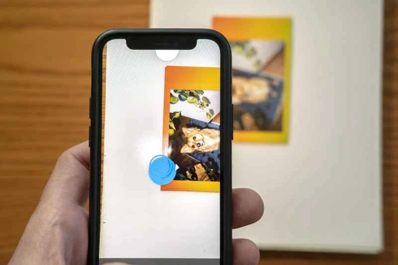 選擇您想要數位化的即時照片,並將其放置在平坦的表面上,最好是純色背景。我用的是筆記本的封面。開啟應用程序,將手機對準照片,並將影像對準 PhotoScan 的取景框。然後,點擊螢幕底部的大圓形按鈕。這將啟動數位化過程。