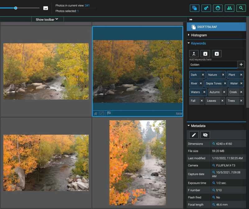 所有元資料都儲存在應用程式的資料庫中,而不是與圖像本身放在一起,這樣就不會讓您的圖像目錄充斥著應用程式特定的檔案(我個人很討厭這一點,可能是因為我最終要測試太多不同的應用程式)。如果您希望將資料與文件放在一起,可以選擇始終使用邊車文件,它會將資訊寫入標準的 .XMP 文字檔案。或者,您也可以手動將元資料儲存在邊車檔案中,僅用於您需要的影像。