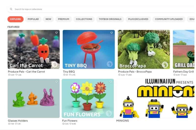 「探索」標籤讓您可以存取經過 Toybox 團隊測試和認可的預製列印件。這些列印件品質優良,每次都能成功列印,是您使用 Toybox 3D 列印機的最佳選擇。選項包括完全免費的列印件、需要使用「Bolts」(應用程式內貨幣)購買的列印件以及 Toybox Plus 會員專屬列印。包含第三方智慧財產權的列印件通常需要使用 Bolts 或訂閱才能存取。