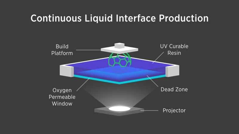 現有的3D列印方法使用液態樹脂,以緩慢的方式逐層建造物件:列印一層,固化,補充樹脂,如此循環往復。在CLIP系統中,投影機從下方用紫外光投射出物體連續的、肉眼幾乎無法察覺的超薄橫截面。紫外光會使液態樹脂池底部上方一層液體的固化。同時,一個平台持續地將正在成型的物體從樹脂中提升出來。