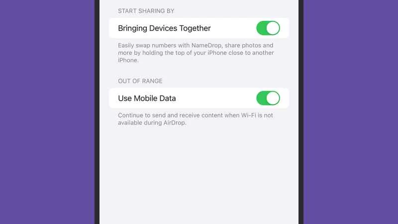 確實,在手機上安裝 iOS 17.1 更新後,NameDrop 功能預設為啟用。如果您不想啟用這項增強的聯絡人共享功能,請開啟“設定”,輕點“一般”和“隔空傳送” ,然後關閉“將裝置連接到一起”開關。