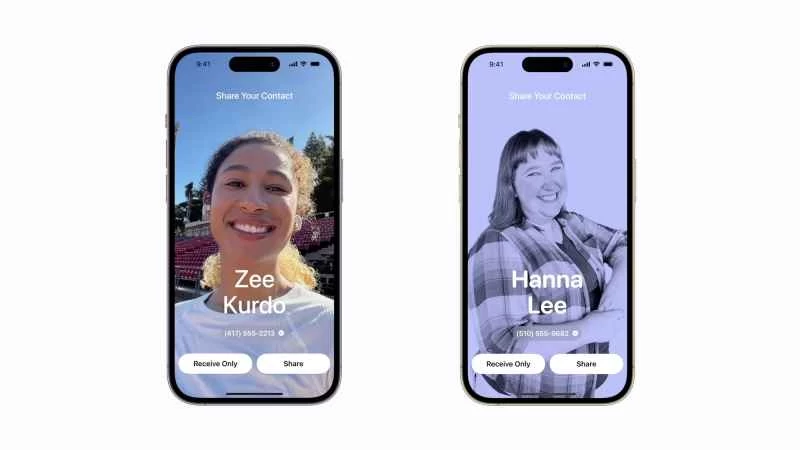 AirDrop 的第一個新功能是 NameDrop,它簡化了共享聯絡資訊的流程:如果您遇到一位也使用 iPhone 的新朋友,您只需解鎖各自的手機,然後將它們輕觸在一起,即可彈出共享聯絡資訊的提示。
