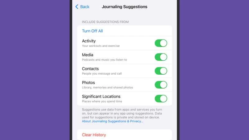 為了方便日後管理日記建議,您可以前往「設定」:選擇「隱私權與安全性」 ,然後選擇「日記建議」開啟或關閉這些建議(或開啟部分建議)。如果您不希望此類資訊儲存在您的 iPhone 上(這些資訊絕不會傳送到其他任何地方),也可以清除日記建議歷史記錄。