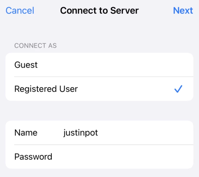 如果連接的是 Mac 電腦,請使用您登入該裝置的使用者名稱和密碼。如果連接的是 Windows 電腦,請使用您先前建立的憑證。