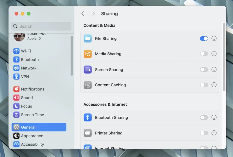 在 Mac 上開啟「系統設定」 ,您可以在 Dock 欄中找到它,或點擊螢幕左上角的蘋果標誌,然後點擊「系統設定」 。在左側面板中點選「通用」 ,然後點選「共享」 。確保「檔案共用」已開啟。