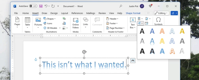 請注意,Mac 版 Word 不支援此功能。沒關係:Mac 用戶不配擁有藝術字。但是,如果您是少數幸運兒之一,您會發現一切都那麼美好——尤其是當您點擊選項、輸入一些文字並選擇字體時。