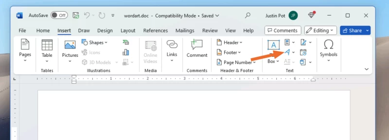 您現在處於所謂的「相容模式」。簡單來說,微軟希望確保您可以使用當前版本的 Microsoft 瀏覽器打開二三十年前的文檔,並保留所有功能——包括藝術字。點擊先前在「插入」標籤中點擊過的藝術字圖示。