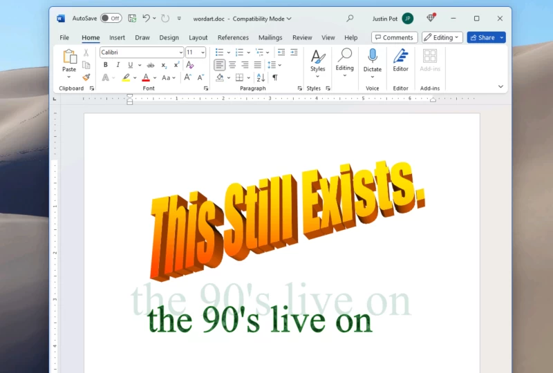 平面設計是我的摯愛,所以我自然而然地鍾情於復古的 90 年代 WordArt 功能。這項功能曾是微軟 Word 的特色功能,它能讓你為任何想要的文字創造永恆的「3D」效果。它堪稱完美,但不知何故,微軟在 2000 年代後期對這項功能進行了徹底的改造,基本上毀掉了它。