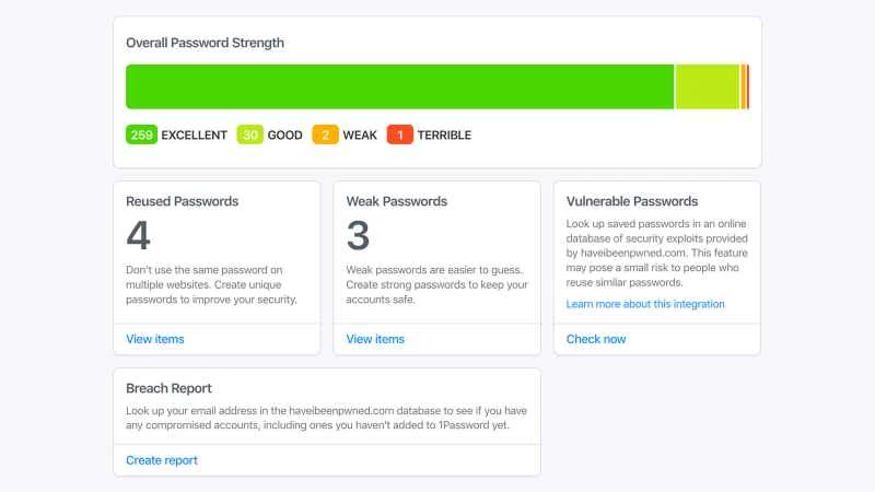 使用密碼管理器的使用者應該也能在軟體中找到類似的功能。例如,受歡迎的 1Password 就有一個名為 Watchtower 的功能:它會在您的密碼強度不足、連結到被入侵的網站或已被多次使用時發出警告。