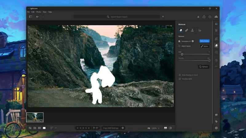 在 Lightroom 中,點擊右側的「移除」工具(圖示類似橡皮擦),然後透過出現的滑桿調整畫筆大小。確保已選取「生成式 AI」 ,然後在要移除的圖片部分上塗抹。