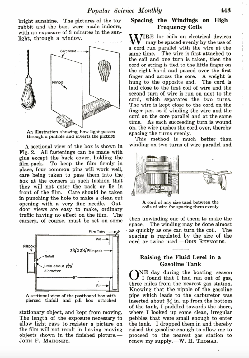 即使工業相機普及開來,仿照攝影術鼻祖暗箱原理製作的自製相機,也就是針孔相機,仍然廣受歡迎。它只需要一個小容器,像是鞋盒,和一些相紙。事實上,早在一百多年前, 《大眾科學》雜誌就開始刊登自製針孔相機的教學。 1918年的一篇文章推薦用紙板盒,裡面放上一張錫箔紙和一個藥盒來做鏡頭。用針在錫箔紙上紮個孔,讓光線進入室內。