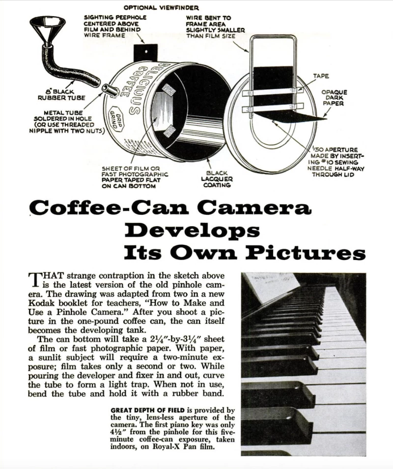大約在16世紀,咖啡在近東地區流行起來,咖啡館也隨之興起,並迅速發展成為重要的文化中心。同時,複式顯微鏡和望遠鏡等光學發明也相繼問世。其中,暗箱成為工匠們捕捉相對清晰的現實世界影像的必備工具。多年後的1961年1月, 《大眾科學》雜誌刊登了一篇利用暗箱物理原理製作自製咖啡罐相機的教程,將看似不起眼的咖啡罐與文藝復興時期的發明巧妙結合。在當時乃至現在,用咖啡罐製作一台既能拍照又能沖洗膠卷的相機,也就是像寶麗來相機那樣拍攝「即時」照片的裝置,都是一項新穎的創舉。讓我們深入了解這項技術。