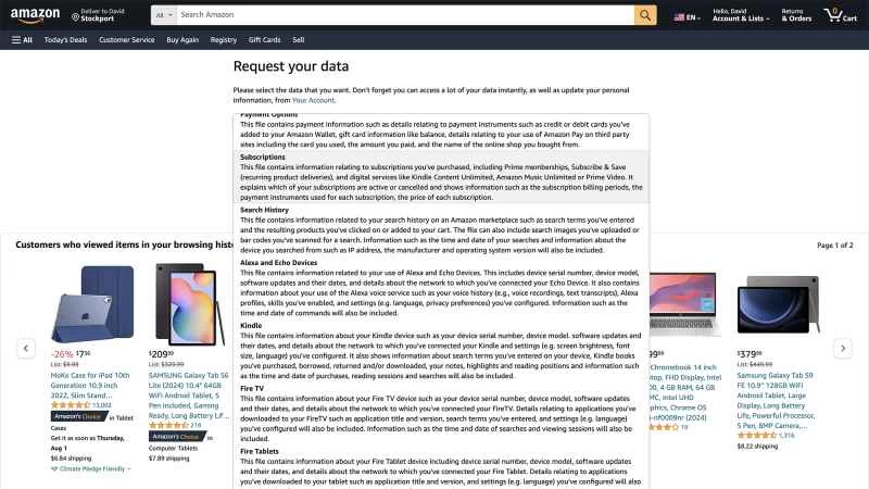 登入亞馬遜網站,將滑鼠懸停在「帳戶與清單」(右上角),然後選擇「您的帳戶」 。在下一個畫面上,您應該會看到一個「請求您的資料」的連結:您可以選擇資料類型(例如「搜尋記錄」),或「要求您的所有資料」 。