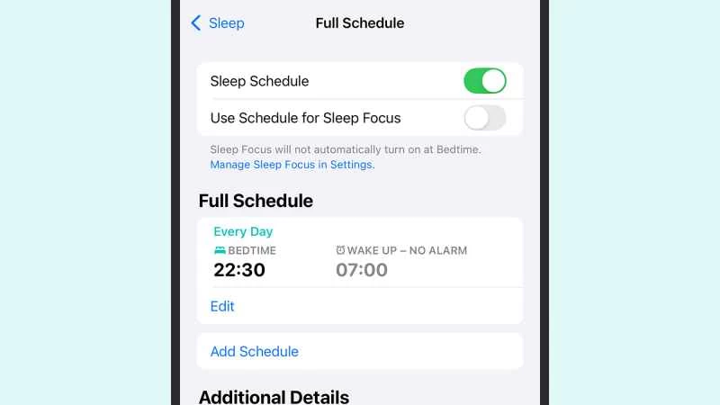 如果你願意,也可以設定睡眠時間表來配合你的睡眠專注模式:這意味著睡眠專注會在一天中的某些時間自動啟動,省去了你手動啟用它的麻煩(雖然你也可以手動啟用),並有望確保你每晚都能在固定的時間上床睡覺。