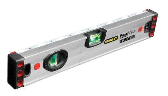 史丹利(Stanley)的這款帶照明的水平儀共有三種長度,輕巧的鋁製框架內嵌有明亮的白色LED燈,可照亮兩個氣泡管,方便檢查水平或垂直度。 LED燈由電池供電,可開關,使用三顆AAA電池可續航約60小時。水平儀頂部配有半透明標尺,同樣由LED燈照明,可快速測量牆柱或磁磚間距等尺寸。