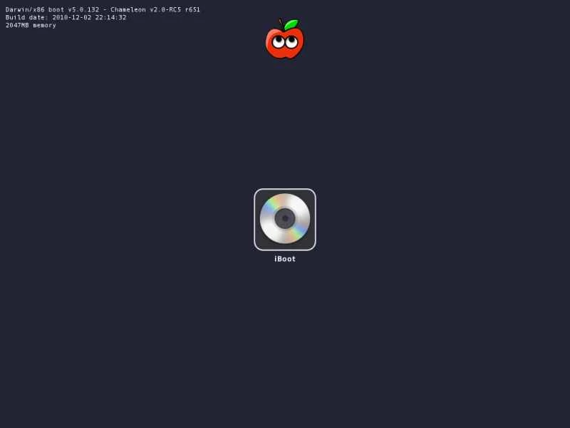 按照 Tonymac 的指南,下一步是下載 iBoot 光碟鏡像,並使用「磁碟工具」或類似軟體將其刻錄到光碟上。將光碟放入光碟機並啟動電腦,電腦應該會從光碟啟動(如果未啟動,您可以在啟動時按 F12 鍵(適用於技嘉主機板)手動選擇啟動光碟)。光碟機發出一些嗡嗡聲後,您很快就會看到類似這樣的螢幕:
