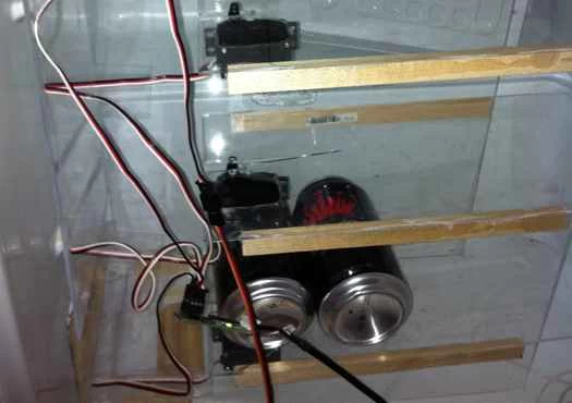 飲料儲存:層架略微向下傾斜,使罐裝飲料能夠滾動到分配器處。在層架的底部,一個連接伺服馬達的機械手臂將罐裝飲料固定到位。當伺服馬達接收到縮回訊號時,罐裝飲料會經由冰箱上的開口送入飲料機的發射管內。