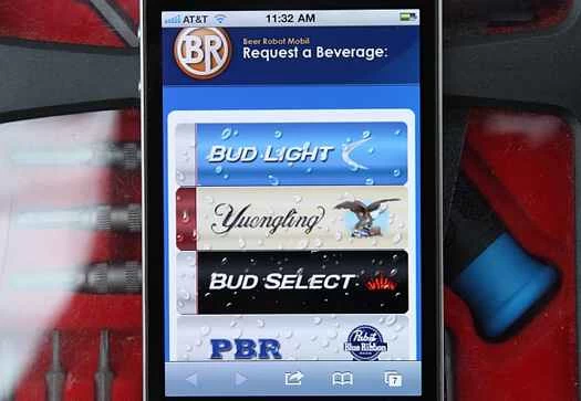 項目的其他部分也慢慢成型。自動販賣機的裝置是一系列安裝在冰箱內部的傾斜層架,兩端各有一個伺服馬達。啤酒透過漏斗流入一個大砲,整個裝置安裝在一個旋轉底座上,可以轉動以便瞄準發射方向。我的朋友喬什·莉莉幫我設計了一個iPhone應用程序,它可以選擇飲料、瞄準大砲並發射。