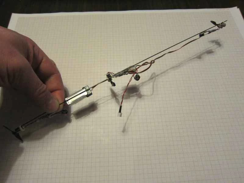 - 一顆70至140毫安培時的1S鋰聚合物電池(以及適當的充電器):為了將重量控制在10克以下,需要使用最小的電池(70毫安培時的電池重量約為2.5克)。較大的電池顯然可以延長飛行時間,但即使飛行時間很大程度取決於飛行方式,使用125毫安培時的電池(重量為3.5克)也能輕鬆飛行半小時。較小的電池也能輕鬆飛行15分鐘或更久,並且能夠延長乳膠氣球的飛行時間(騰出空間放置更多配重來彌補氦氣的損失)。