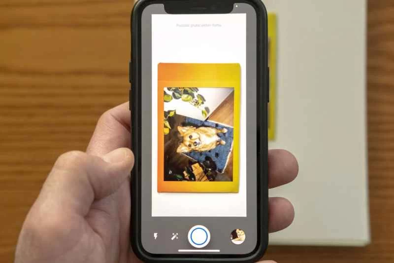 選擇您想要數位化的即時照片,並將其放置在平坦的表面上,最好是純色背景。我用的是筆記本的封面。開啟應用程序,將手機對準照片,並將影像對準 PhotoScan 的取景框。然後,點擊螢幕底部的大圓形按鈕。這將啟動數位化過程。