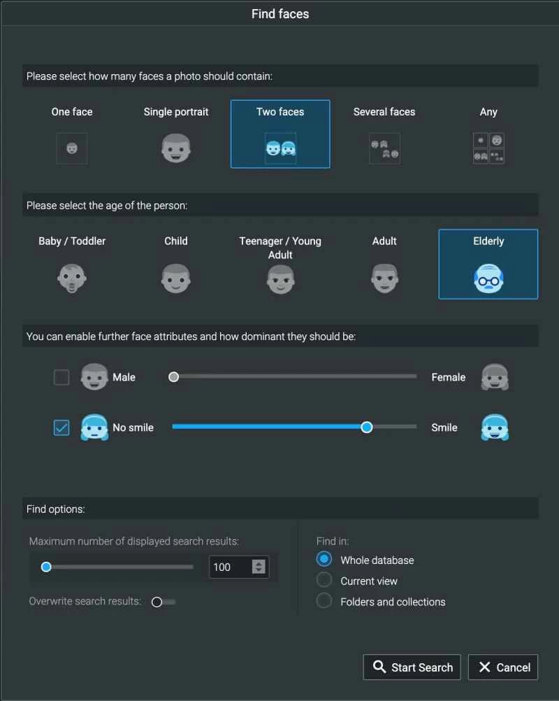 或者考慮一下在照片中尋找人物的功能。 「查找人臉」搜尋功能提供了多種選項,包括顯示的人臉數量、大致年齡、男女比例,以及是否喜歡微笑表情等。