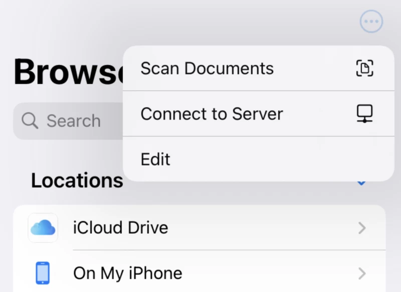 如果您的網路上已有共用資料夾,您可以在 iPhone 和 iPad 上預先安裝的「檔案」應用程式中連接到它們。在 iPhone 上,點選右上角的三點選單;在 iPad 上,同樣的按鈕位於左側邊欄的右上角。點選「連接到伺服器」 。