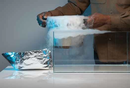 六氟化硫(SF6)通常用作高壓設備中的火花抑制劑,它是一種無色無味的氣體,密度幾乎是空氣的五倍,因此非常適合用來展示這種現象。我讓SF6緩慢地充滿一個水族箱,然後滑開蓋子,留下了一灘無色無味的氣體,這灘氣體在裡面停留了幾分鐘。當我把一艘輕錫箔紙船放在水族箱上時,它竟然漂浮在看似空無一物的表面上。
