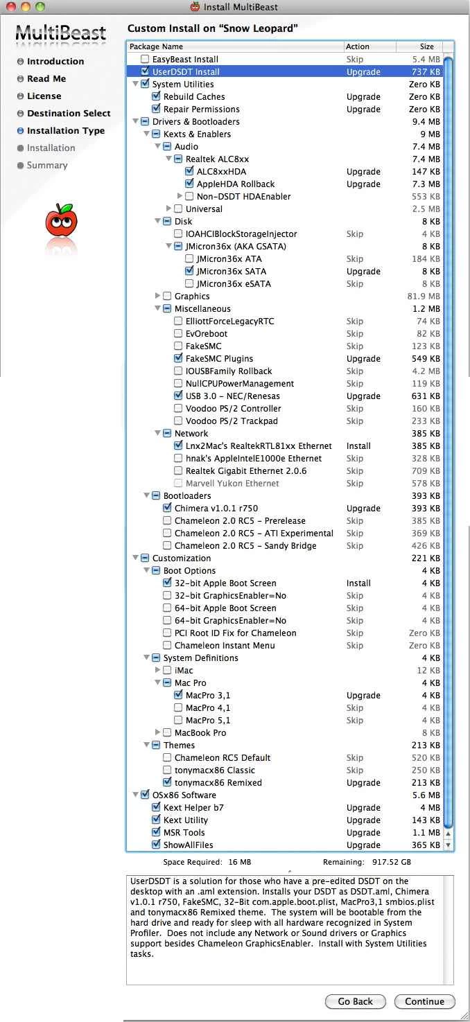 您可以將 MultiBeast 看作是一個軟體包安裝程序,而不是一個獨立的應用程式。它允許您從一系列設備驅動程式和啟用程式中進行選擇並安裝;您只需要安裝適用於您硬體的那些。 MultiBeast 安裝的大部分內容最終都會位於兩個資料夾中:/System/Library/Extensions 或 /Extra/Extensions。它還提供了一些您可能需要的實用工具,位於「OSx86 軟體」標題下——建議您也安裝這些工具。除了安裝軟體之外,您還可以使用 MultiBeast 重建核心擴充 (kext) 快取並修復系統權限,這兩項操作在您新增或移除 kext 時都是必要的。這些選項位於「系統實用工具」下。如果您需要更改任何設置,可以再次運行 MultiBeast 並僅選擇要更改的新選項——它不會刪除先前安裝的任何內容。
