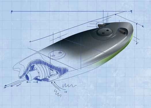 有了零件,伍茲沿著水線將一塊現成的膝板拆開,裝上噴水泵、一台26cc發動機和一個遙控飛機的啟動器,然後用膠帶把外殼粘了起來。它運轉時發出咳嗽聲,發出咔噠聲,但至少能動。很快,伍茲就開始每隔一年左右就製造一個新版本,不斷調整轉向和推進裝置,把排氣管移到水線以下,並努力找到水泵扭矩和水流量的最佳平衡點。