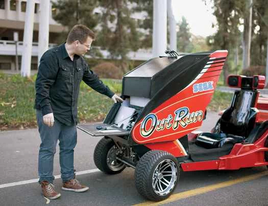 1980年代末,數百萬沉迷於街機遊戲的青少年坐在世嘉(Sega)出品的《OutRun》電子遊戲的模擬賽車座椅上,握住仿製法拉利Testarossa的橡膠方向盤,踩下踏板,想像著自己正馳騁在街頭。 25年後,其中一個孩子——加內特·赫茲(Garnet Hertz)——實現了這個夢想,他改裝了一台重達1100磅的街機,使其能夠在人行道上行駛。
